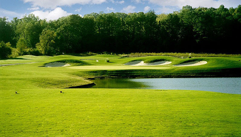 Hole 17 at The Hooch Golf Club is part of an innovative layout that features Crenshaw Bent Grass greens, ponds, lakes and three holes that play along the Chattahoochee River. Photo by David Johnson Golf Design